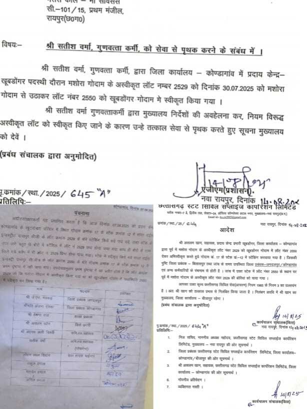 कोंडागांव जिले में दिनांक 7 अगस्त 2025 को सामने आए इस प्रकरण में जाँच के दौरान असलम खान(उस समय कोंडागांव में कनिष्ठ सहायक) तथा सतीश वर्मा (प्लेसमेंट क्वालिटी इंस्पेक्टर, कोंडागांव) को दोषी पाया गया। पंचनामा के अनुसार, एक फेल चावल लॉट को कागज़ों में लॉट नंबर बदलकर पास दर्शाया गया और उसे दूसरे ग्राम में वितरण हेतु चढ़ा दिया गया, जो कि खाद्य सुरक्षा अधिनियम के अंतर्गत गंभीर व दंडनीय अपराध है।